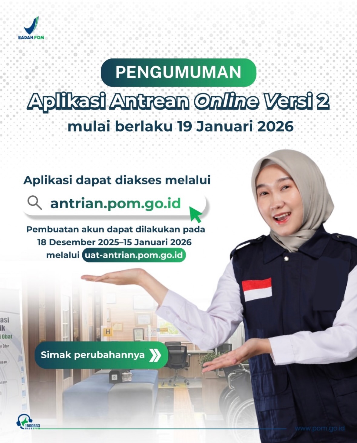 Pendaftaran akun baru dapat dilakukan pada 18–23 Desember 2025 melalui https://uat-antrian.pom.go.id/login