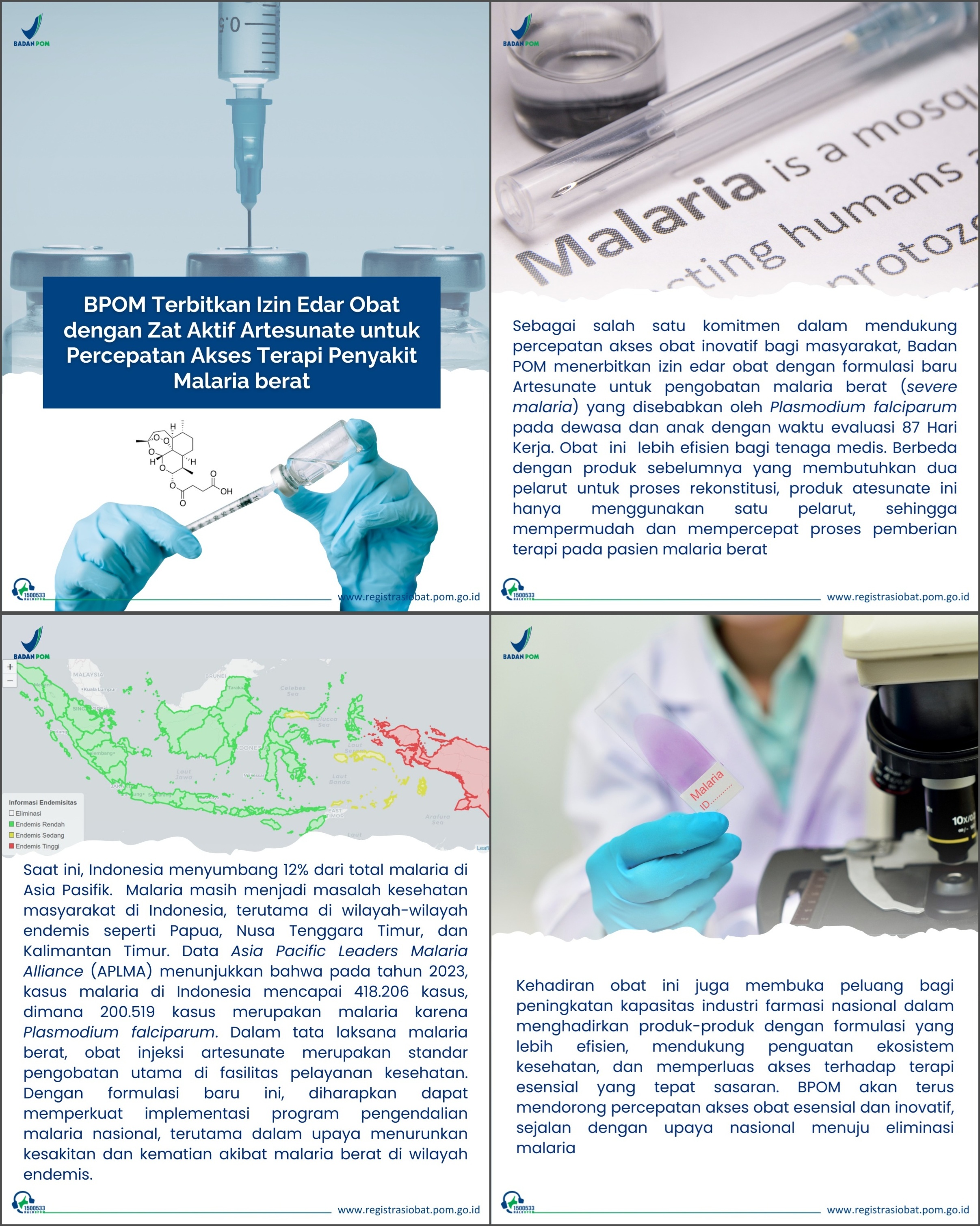 Badan POM telah menerbitkan izin edar obat dengan formulasi baru Artesunate untuk pengobatan malaria berat (severe malaria) yang disebabkan oleh Plasmodium falciparum pada dewasa dan anak. Berbeda dengan produk sebelumnya yang membutuhkan dua pelarut untuk proses rekonstitusi, produk atesunate ini hanya menggunakan satu pelarut, sehingga mempermudah dan mempercepat proses pemberian terapi pada pasien malaria berat.