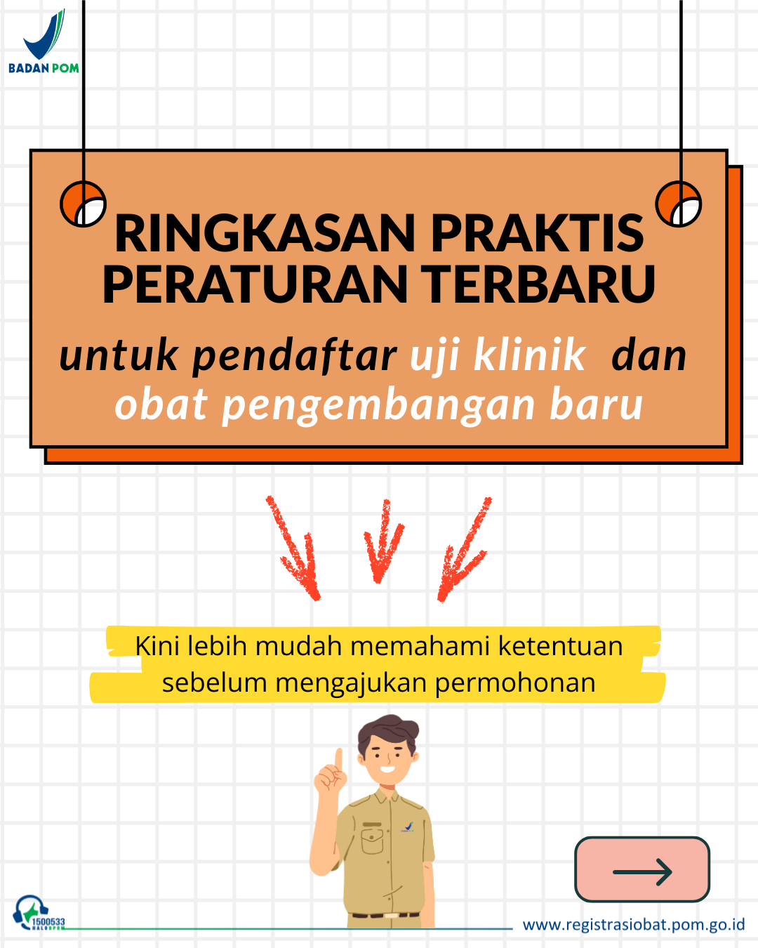 Kabar baik untuk pendaftar Uji Klinik dan Obat Pengembangan Baru! Untuk mendukung kemajuan riset serta mempermudah pendaftar memahami dan mengimplementasikan peraturan terbaru tentang Persetujuan Pelaksanaan Uji Klinik (PPUK) dan Persetujuan Obat Pengembangan Baru (POPB), telah tersedia ringkasan praktis peraturan terbaru persetujuan pelaksanaan uji klinik (PerBPOM Nomor 8 tahun 2024) dan persetujuan obat pengembangan baru (PerBPOM Nomor 24 tahun 2025) dalam bentuk e-booklet yang dapat diunduh di: