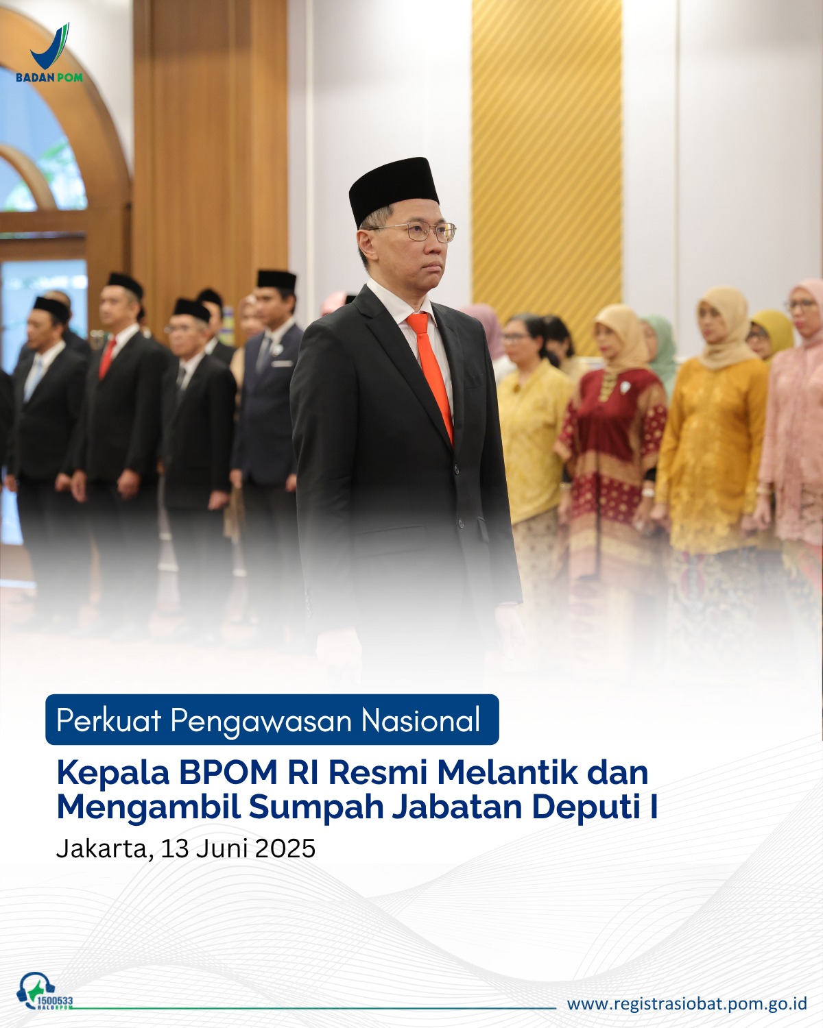 Kepala BPOM RI Prof. Taruna Ikrar, M.Biomed., Phd. resmi melantik dan mengambil sumpah jabatan dr. William Adi Teja, MD., BMed., MMed. sebagai Deputi Bidang Pengawasan Obat, Narkotika, Psikotropika, Prekursor dan Zat Adiktif (Deputi 1) menggantikan Dra. Rita Mahyona, Apt., M.Si. yang telah memasuki masa purna tugas pada hari Jumat, 13 Juni 2025.