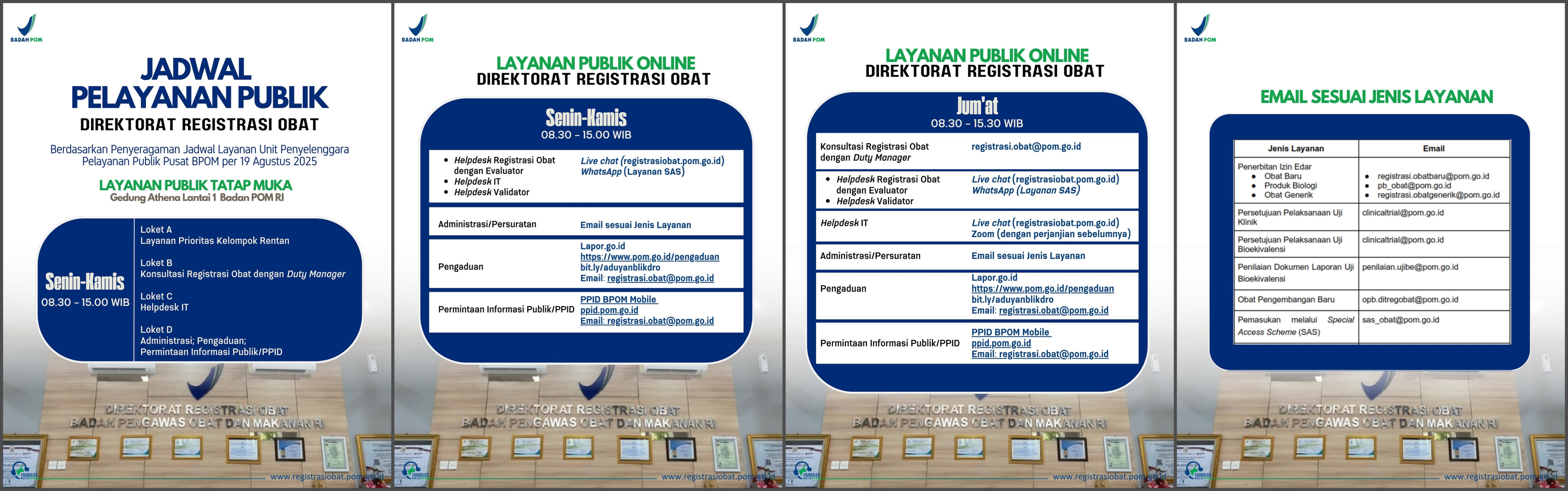 Berdasarkan penyeragaman jadwal layanan Unit Penyelenggara Pelayanan Publik Pusat BPOM per 19 Agustus 2025, terdapat perubahan jam pelayanan Direktorat Registrasi Obat.