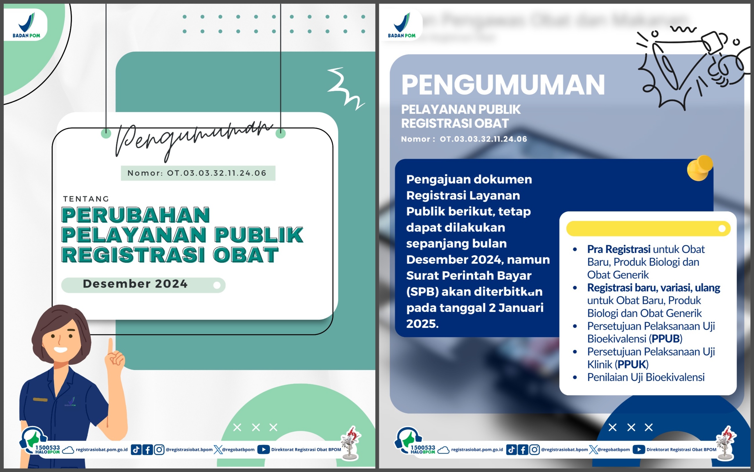 Dalam rangka peningkatan pelayanan publik di Direktorat Registrasi Obat melalui penyelesaian berkas permohonan Registrasi Obat tahun 2024 serta carry over, bersama ini kami sampaikan informasi perubahan sementara layanan publik pada periode 2 Desember 2024 sampai 31 Desember 2024, dengan rincian sebagai berikut: